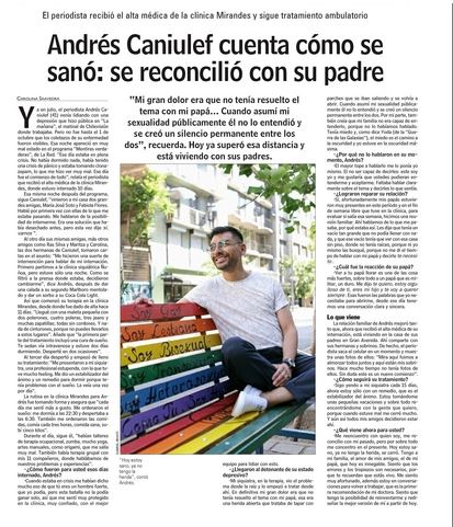 Ya en julio, el periodista Andrés Caniulef (41) venía lidiando con una depresión que hizo pública en «La Mañana», el matinal de Chilevisión donde trabajaba. Pero no fue hasta el 1 de octubre que los coletazos de su enfermedad fueron visibles. Esa noche apareció en muy mal estado en el programa «Mentiras Verdaderas» de La Red. «Ese día estaba en plena crisis. No había dormido nada, había tenido una crisis de pánico y estaba tomando clonazepan, lo que me hizo ver muy mal. Ese día fue el comienzo de todo», relata el periodista que recibió el alta médica de la Clínica MirAndes, donde estuvo internado 10 días.